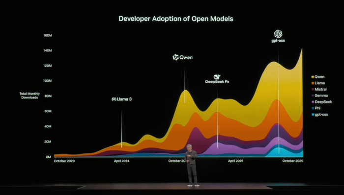 北京时间10月29日凌晨,英伟达CEO黄仁勋在华盛顿举行的2025 GTC 大会上发表主旨演讲时称,开源模型已变得非常强大,大大加速了AI应用的进程,开发者、研究者、全球的公司都需要开源。黄仁勋展示了全球开源模型的下载及采用情况图,2025年以来,来自中国的阿里通义千问Qwen已占据开源模型的大部分市场份额,并且领先优势还在持续扩大中。